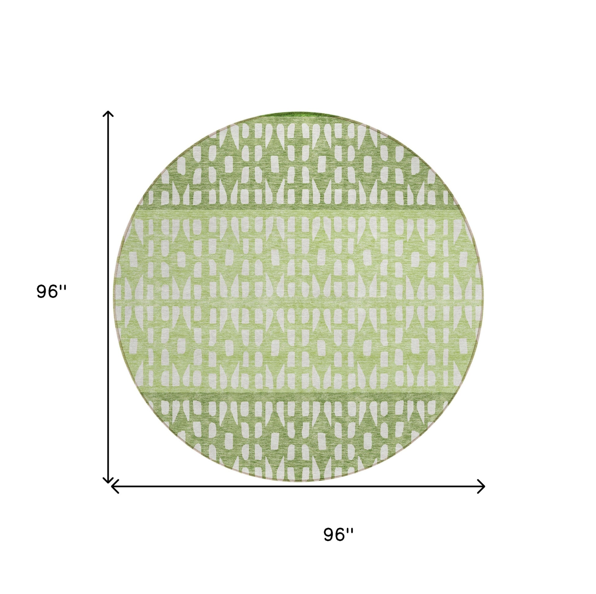 Add great coloration and comfortable texture to your space with this 8-foot green sage and ivory round geometric washable indoor outdoor area rug. This geometric round shaped rug features a geometric pattern in green, sage, and ivory that combines a good looking print with a unique and updated shape. The mix of shape, color, and design gives this rug refreshing visual interest. Ideal for outdoor spaces or high traffic areas with kids and pets, this rug is made from heavy duty polyester that is stain resistant to help repel water, dirt, and stains. Makes a great way to dress up your patio, porch, or poolside, but also works well as a durable and easy to maintain option in the kitchen, family room, or mudroom. 96-inch h x 96-inch w x 0.19-inch d.