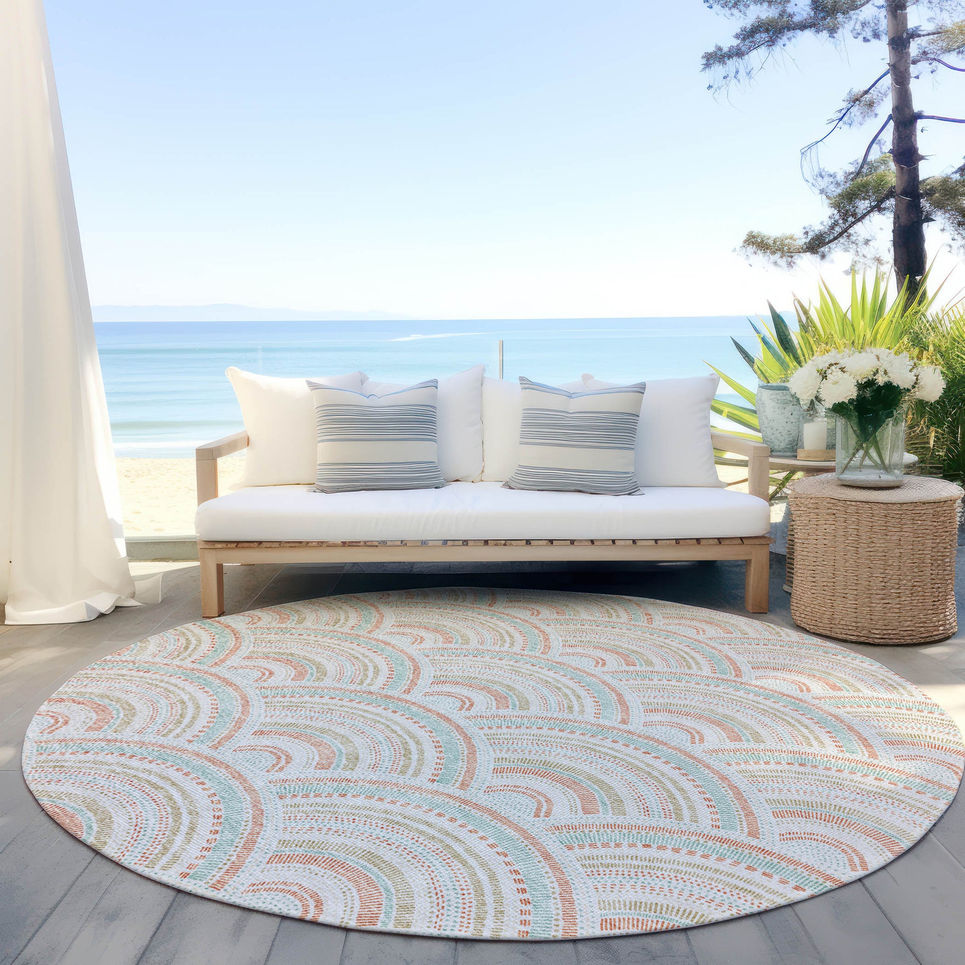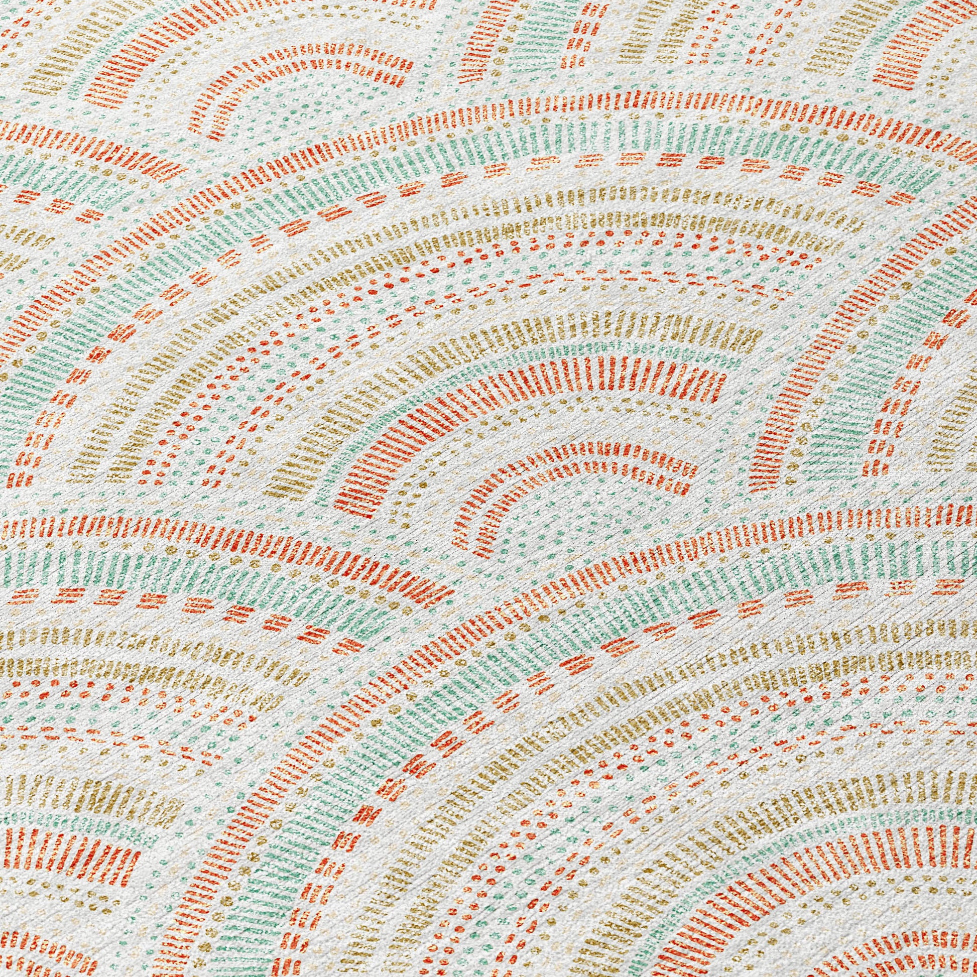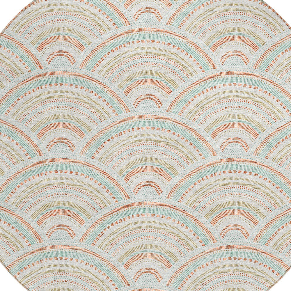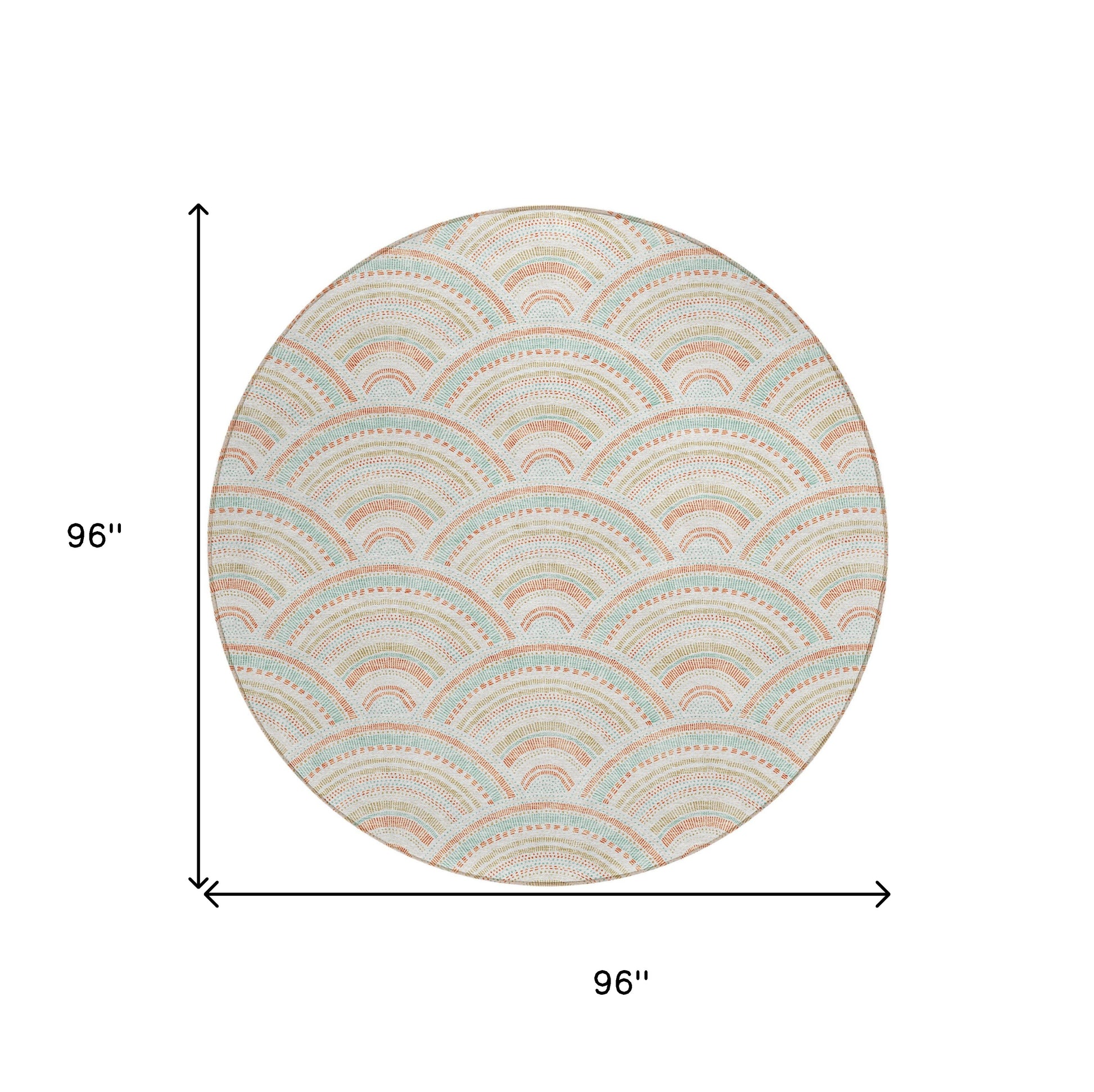 8' Linen Orange And Ivory Round Geometric Washable Indoor Outdoor Area Rug